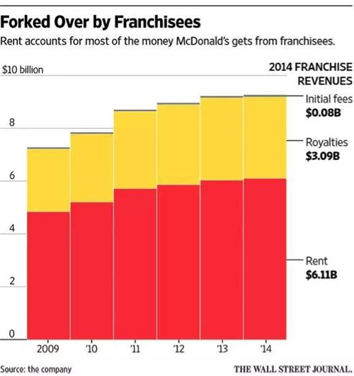這是雷·克羅克在早期設(shè)計(jì)麥當(dāng)勞的特許經(jīng)營(yíng)模式時(shí),就留下的一個(gè)獨(dú)到之處:為了加強(qiáng)控制權(quán),所有門店所需要的土地物業(yè),都要由麥當(dāng)勞總部出面收購,再轉(zhuǎn)租給特許經(jīng)營(yíng)商,每年按略低于市場(chǎng)價(jià)的水平收購租金。在房地產(chǎn)市場(chǎng)節(jié)節(jié)攀升時(shí),租金收入會(huì)水漲船高;而一旦特許經(jīng)營(yíng)商表現(xiàn)欠佳,也可以隨時(shí)將他們“掃地出門”。一些持有麥當(dāng)勞股票的對(duì)沖基金經(jīng)理們甚至曾經(jīng)想過,把麥當(dāng)勞的餐飲和房地產(chǎn)業(yè)務(wù)拆分成兩部分,以便更有效地管理資產(chǎn)。