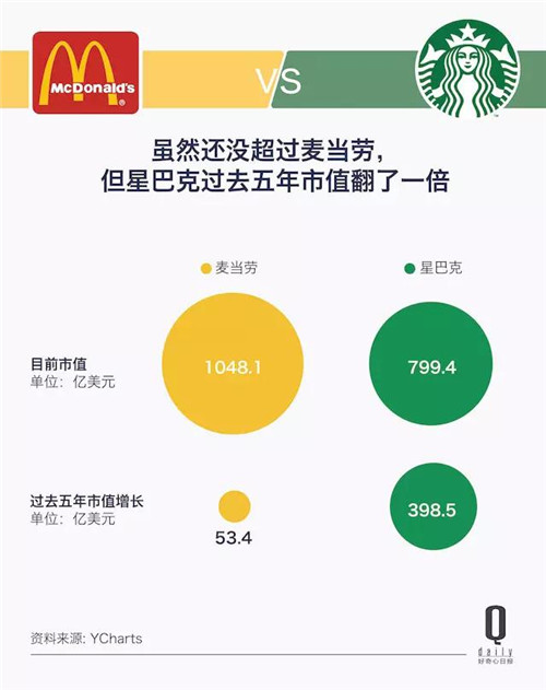 也就是說,星巴克將會(huì)超越麥當(dāng)勞,成為全球最大的連鎖餐飲公司。如果都按照現(xiàn)在我們認(rèn)知意義上的星巴克、麥當(dāng)勞來算,這個(gè)時(shí)間不到 40 年。