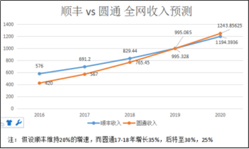 順豐全網(wǎng)收入份額一度達(dá)20%。但隨著增速落后逐年下滑,很可能要失去老大地位。圓通申通單票運(yùn)費(fèi)是順豐的1/2,只要件量是順豐的2倍。就有可能超過順豐。2016年2月圓通老板娘張小娟在杭州兩會(huì)上透露圓通2015年總件量約35億件(實(shí)際30億票),全網(wǎng)營收350億元(實(shí)際可能為300億元)。根據(jù)圓通發(fā)布的業(yè)績預(yù)告,2016年件量和收入都大于40%的增長。全網(wǎng)收入可能超420億元。假若保持這種趨勢下去,圓通甚至中通、申通等都可能在接下來三五年內(nèi)在全網(wǎng)收入上超越順豐, 甚至比順豐提早突破千億大關(guān)。順豐可能掉至三四名甚至更后。