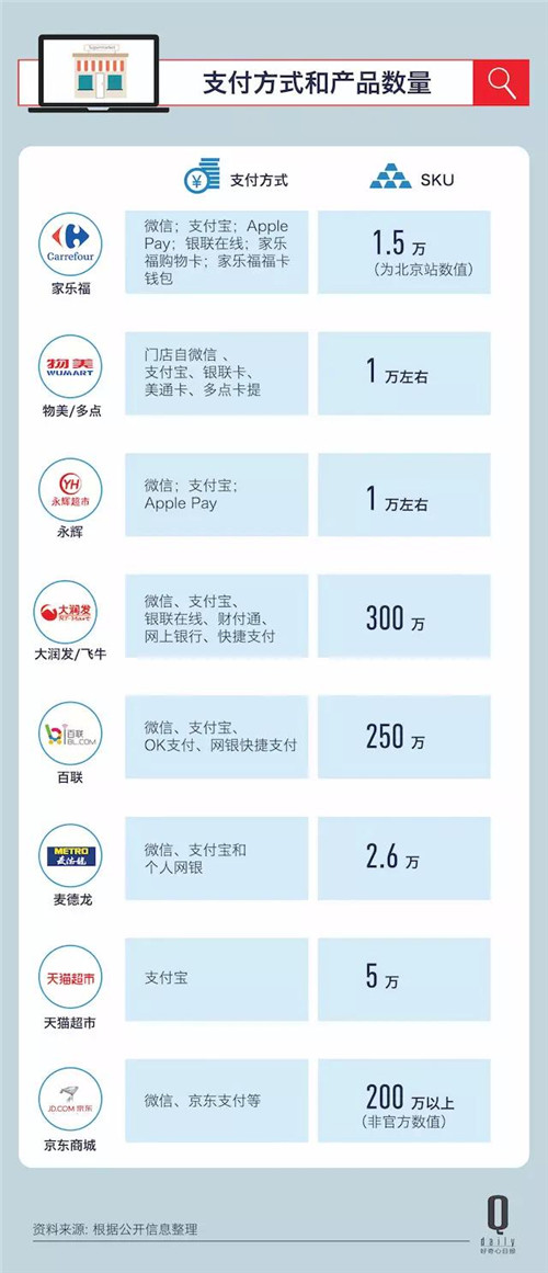 百聯(lián)電商和飛牛網(wǎng)更像京東商城或亞馬遜那樣的線上超市+百貨,SKU (據(jù)說)是百萬級別的。家樂福、麥德龍、永輝和物美/多點則更接近傳統(tǒng)意義上的大賣場超市,以食品和日化用品為主,SKU 在1~2 萬。