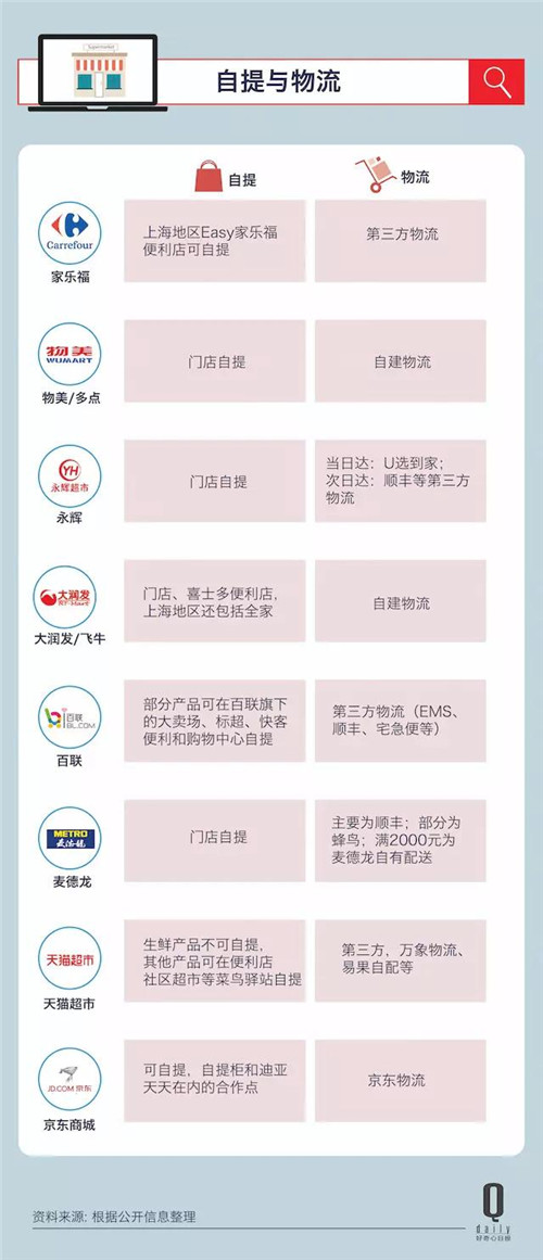 除了多點(物美)和飛牛網(wǎng)(大潤發(fā))用自有物流配送之外,其他的超市電商都是外包給第三方快遞公司。