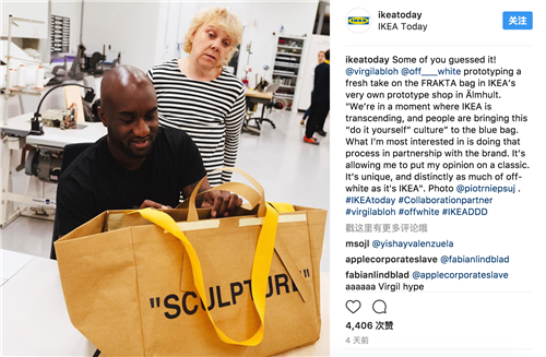 宜家宣布合作的同時,還在其官方ins上面貼出了 Off-White 創(chuàng)始人兼創(chuàng)意總監(jiān) Virgil Abloh 設計的聯(lián)名 FRAKTA 購物袋,包的一側還寫著“sculpture”。