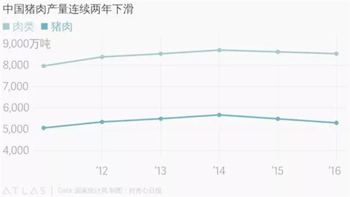 一直以來,中國都是肉類消費大國。按照美國農(nóng)業(yè)部的估計,中國消費者今年所食用的豬肉、牛肉和雞肉加起來會是美國消費者的兩倍。不過,國家統(tǒng)計局的數(shù)據(jù)顯示,2015 年開始,中國肉類消費有所下降。去年,國內(nèi)肉類產(chǎn)量同比下降了 1%,而占比最高的豬肉產(chǎn)量同比減少了 3.4%。