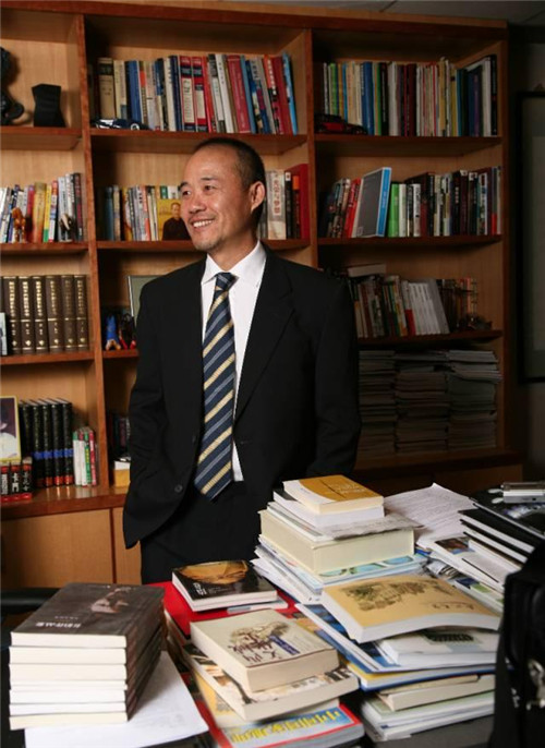 2007年1月,王石在萬(wàn)科的深圳辦公室里,他的辦公桌被各種書籍包圍。(攝影 / 鄧攀)