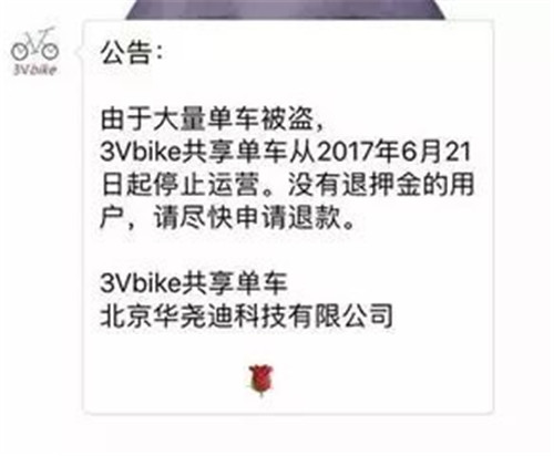 6月21日,共享單車平臺(tái)3Vbike對(duì)外宣布稱,由于單車大量被盜,即日起停止運(yùn)營(yíng)。并提醒沒有退押金的用戶盡快申請(qǐng)退款。