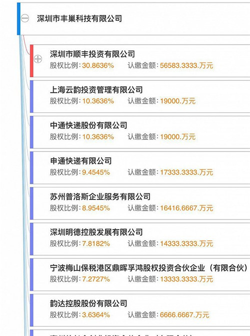 記者在企業(yè)工商信息查詢(xún)得知,目前豐巢科技最新的股權(quán)結(jié)構(gòu)為,深圳市順豐投資有限公司為大股東,持股30.8636%,韻達(dá)系(上海云韻投資+韻達(dá)控股)為第二股東,持股共14%,中通持股10.3636%,申通持股9.4545%。