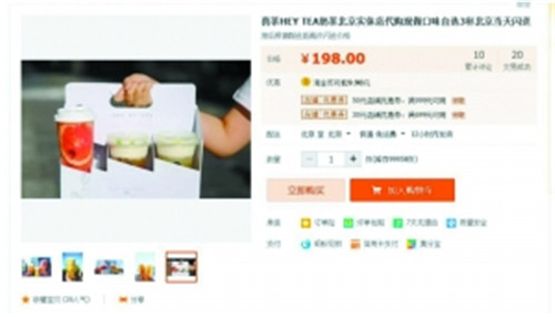北京市場已有淘寶商家專門做起喜茶代購的服務(wù)。北京商報(bào)記者在一家提供喜茶代購服務(wù)的網(wǎng)店中注意到,代購一杯喜茶的跑腿費(fèi)用報(bào)價(jià)為66元,3杯起送,即一次代購產(chǎn)生的跑腿費(fèi)用至少為198元。