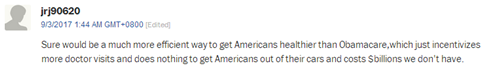 網(wǎng)友jrj90620:“對美國人的健康來說,共享單車可比奧巴馬醫(yī)保更有效?!?/font>