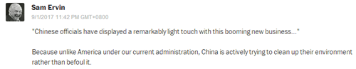 網(wǎng)友Sam Ervin:“‘中國官員對蓬勃發(fā)展的共享單車業(yè)務(wù)表現(xiàn)出柔性的監(jiān)管姿態(tài)?!绹灰粯樱袊诜e極地改善環(huán)境,而不是破壞環(huán)境?!?/font>