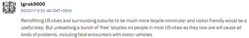 網(wǎng)友Igrok9000:“使用自行車確實利于改善城市和郊區(qū)環(huán)境。但對于美國大多數(shù)城市來說,一下子涌現(xiàn)出大量自行車,會引發(fā)各種各樣的問題,比如與機動車相撞?!?/font>