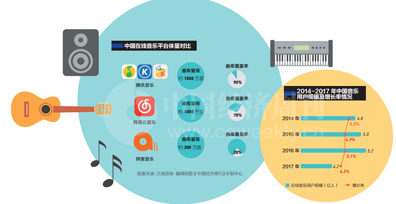 2016年7月,QQ音樂與酷我音樂、酷狗音樂并入騰訊音樂旗下后,騰訊開始對數(shù)字音樂版權(quán)著重布局。2017年3月和5月,騰訊音樂先后拿下中國大陸地區(qū)對環(huán)球音樂所擁有的音樂詞曲獨(dú)代權(quán)和數(shù)字版權(quán)分銷權(quán),并為此付出了3.5億美元現(xiàn)金及購買環(huán)球音樂1億美元期權(quán)的代價?!敖刂聊壳埃蚍秶鷥?nèi)有200多家唱片公司持有數(shù)字音樂的版權(quán),目前90%以上都已經(jīng)被騰訊拿下?!币晃痪W(wǎng)易云音樂內(nèi)部人士告訴《中國經(jīng)濟(jì)周刊》記者,騰訊音樂目前擁有的版權(quán)數(shù)量、廣度和對版權(quán)的投入都是業(yè)內(nèi)第一,其中不少是“獨(dú)家代理權(quán)”,相當(dāng)于緊緊地扎起了一個籬笆。