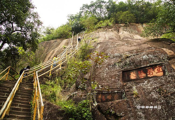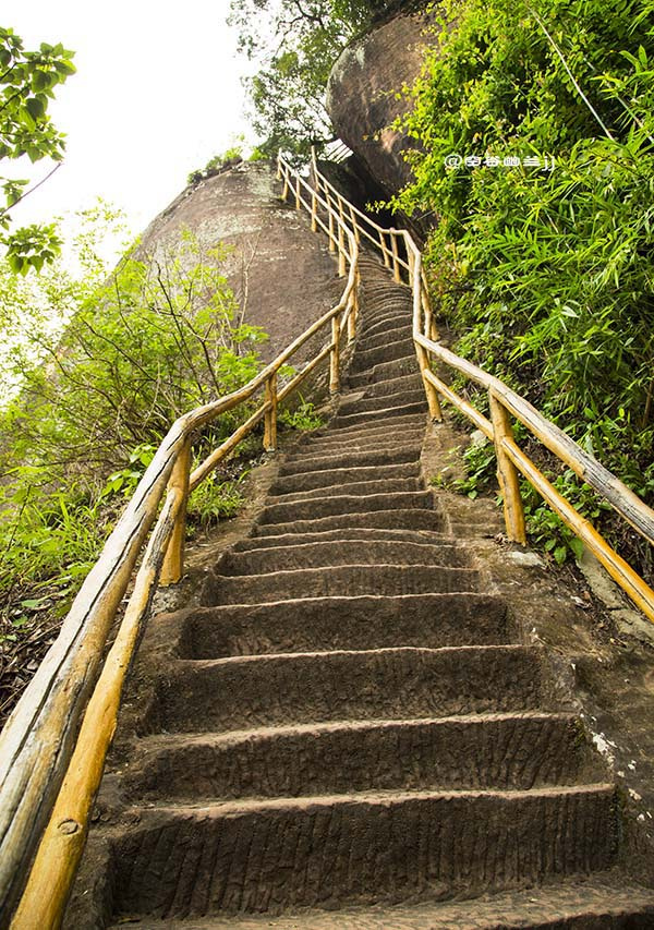 丹梯鐵鎖位于中層風景區(qū)至山頂?shù)膽已虑捅谏?,下接“呼吸通天”。原中層到上層,本無道路可通,后來經(jīng)人工在這里開鑿石階,旁邊輔以鐵鎖鏈,方成通道,并以“丹梯”命名。