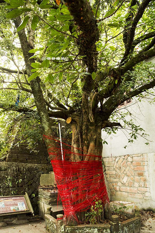 鴛鴦樹生長在六祖堂舊址旁邊。遠看,它婷婷玉立如一體,枝葉婆娑不分彼此;近看,則可辨清樹干一里一外,兩種不同科目的樹相互依存。一株四百多歲的百日青,一株一百多歲的筆管榕,它們的樹葉交錯,各現(xiàn)姿容,好象久別重逢的情侶,互相擁抱著站立在幽靜的山谷間。