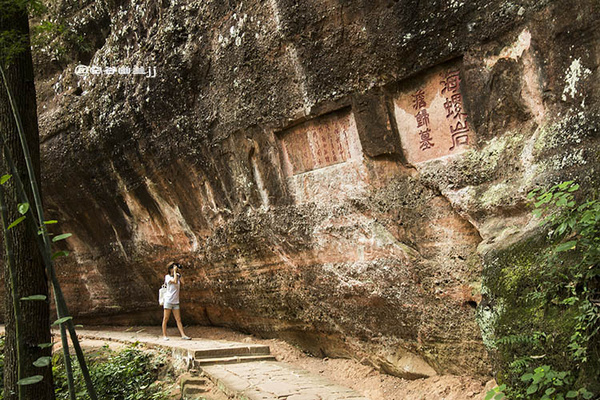 紫玉臺摩崖石刻,此處巖峰聳立,峰頂坦礪如平臺,石質(zhì)晶瑩如紫玉,因而得名為“紫玉臺”。每當秋高氣爽之日,游人登臨其上,則胸襟清朗,煩慮頓消。