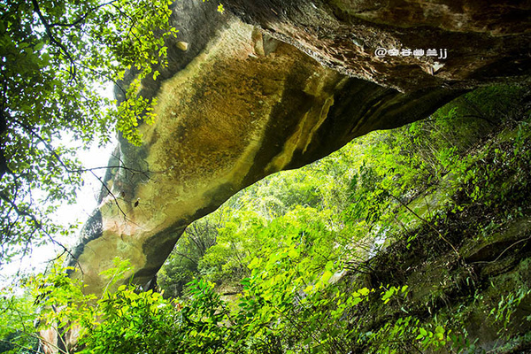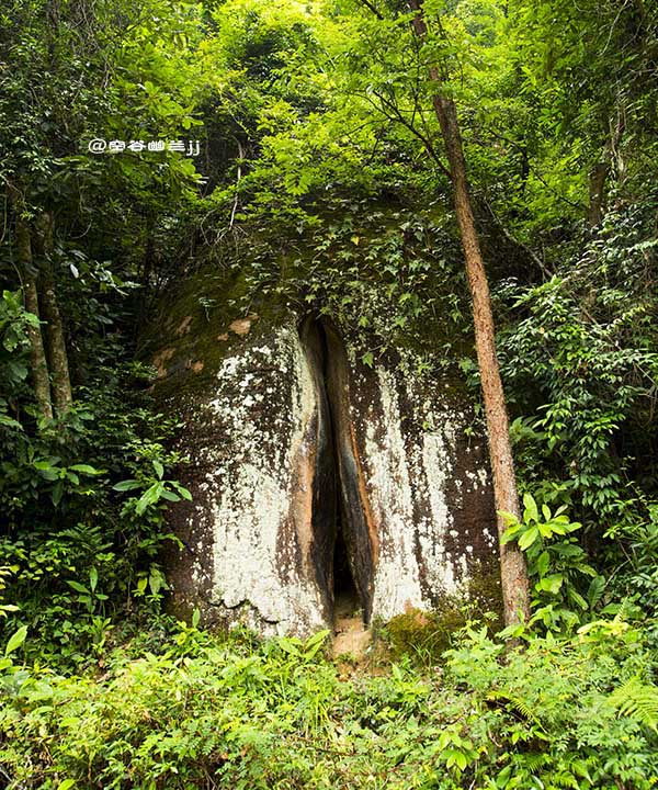 福音峽。這里懸崖相依,兩山并立,相距不過數(shù)尺,遠觀之則只見藍天一線自峽中露出,故名“一線天”。右邊一石,形如草鞋。據(jù)說:人立在峽中,面向南大喊,若有四聲回音,則此人將有福緣,故此峽名“福音峽”。