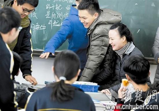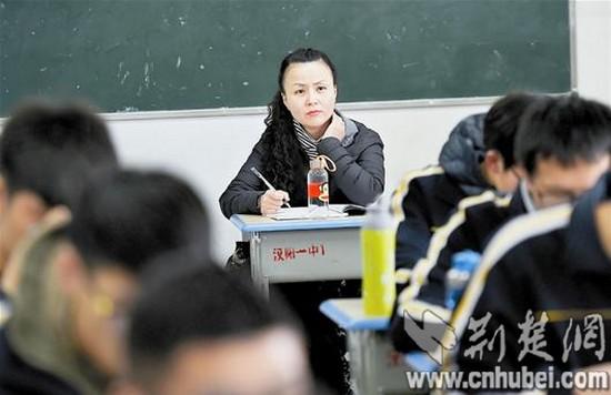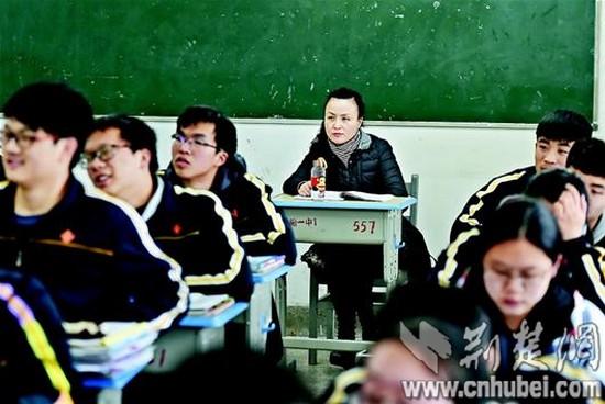 9日上午10時(shí)30分許,記者首先來到漢陽一中高二(15)班。這是一堂歷史課,老師講得神采飛揚(yáng),同學(xué)們聽得津津有味。教室最后一排坐著一位中年女士,時(shí)而認(rèn)真聽講,時(shí)而埋頭記筆記。