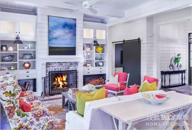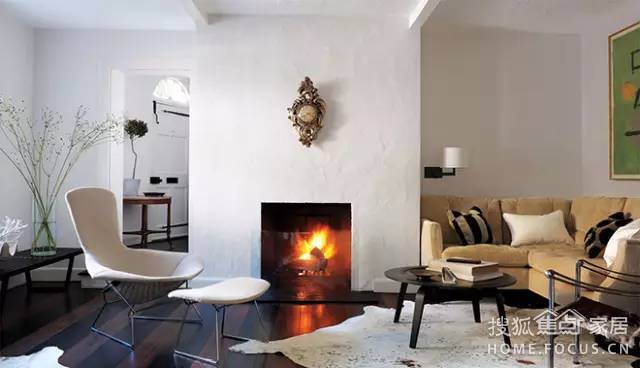 幾個(gè)沙發(fā)和壁爐圍在一起,看上去暖暖的。另外,壁爐也能起到輔助照明的作用。