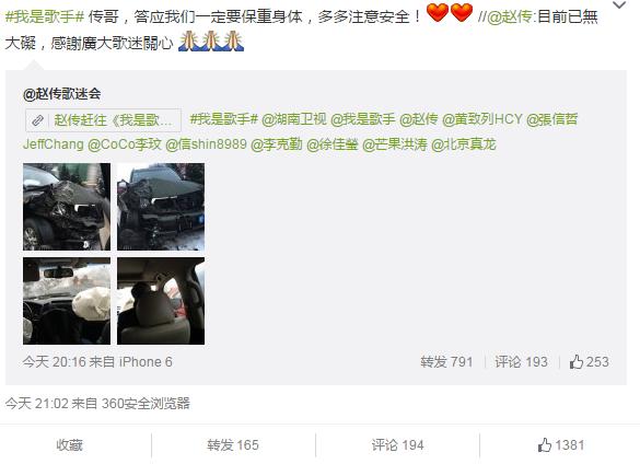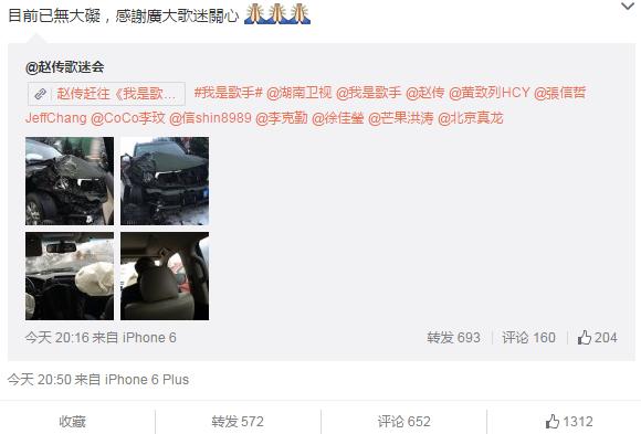2月4日晚,ID為“趙傳歌迷會”的微博發(fā)布了一篇文章,描述了歌手趙傳在前往《我是歌手》錄制現(xiàn)場的途中發(fā)生車禍的情況。文章發(fā)布后不久就引發(fā)了網(wǎng)友熱議,趙傳本人也轉發(fā)了該微博并寫到:“目前已無大礙,感謝廣大歌迷關心”。確認了消息的真實性。