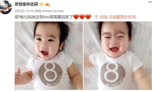 林志穎的長(zhǎng)子Kimi已經(jīng)6歲,雙胞胎兒子則是2015年12月才生下來(lái),他4日在社交網(wǎng)站曬出雙胞胎兒子的照片,用童稚的語(yǔ)氣寫(xiě)道“耶!爸比媽咪還有kimi哥哥要回家了,好想你們喔”,照片中可以看到2個(gè)兒子穿著印有8個(gè)月的寶寶衣,似乎在暗示雙胞胎又長(zhǎng)大1個(gè)月了。