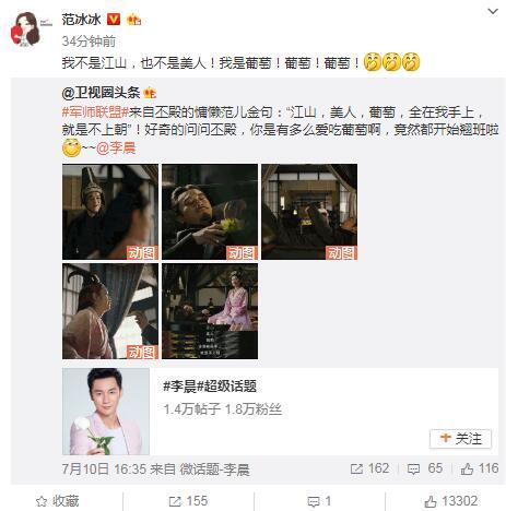 范冰冰看到后,轉(zhuǎn)發(fā)這條微博,還稱自己不是江山、也不是美人,只是一顆葡萄,緊接著一連四個(gè)感嘆號(hào),把自己比作李晨愛吃的葡萄,不少網(wǎng)友看到覺得驚呆了,范爺也變得有點(diǎn)污。