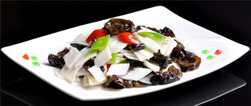 清炒山藥木耳:第一步準(zhǔn)備食材,把山藥用火燎掉須根,用工具打去表皮,洗凈切成梯形寸段,焯水30秒撈出投涼,切成菱形片,焯水30秒撈出投涼;然后將木耳摘洗干凈,撕成小塊,焯水1分鐘撈出投涼;準(zhǔn)備好蔥姜切絲。第二步:將鍋中加植物油燒熱,下蔥姜絲爆香,倒入蠔油山藥和木耳,烹入料酒,撒上精鹽翻炒均勻,勾薄芡,放味精,淋明油出鍋裝盤(pán)即可。