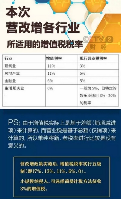 5月1日“營改增”全面推開,建筑業(yè)、房地產(chǎn)業(yè)、金融業(yè)、生活服務業(yè)將告別營業(yè)稅。這項看起來“高大上”的改革,涉及近千萬戶新納稅人、全年減稅超5000億元。營業(yè)稅退出歷史,你我能獲多大好處?