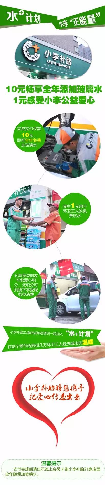 為了讓更多城市建設(shè)者們有一個(gè)安全飲水的固定場(chǎng)所,發(fā)揮車主自身的愛心,為創(chuàng)造'鄭州藍(lán)'的環(huán)衛(wèi)工人提供一個(gè)健康,便捷的飲用水領(lǐng)取站。河南經(jīng)濟(jì)廣播聯(lián)合小李補(bǔ)胎特推出“水+計(jì)劃”愛心公益活動(dòng),車主只需10元即可暢享全年添加玻璃水 ,小李補(bǔ)胎連鎖會(huì)從每10元中拿出1元建立環(huán)衛(wèi)工人免費(fèi)領(lǐng)水站。