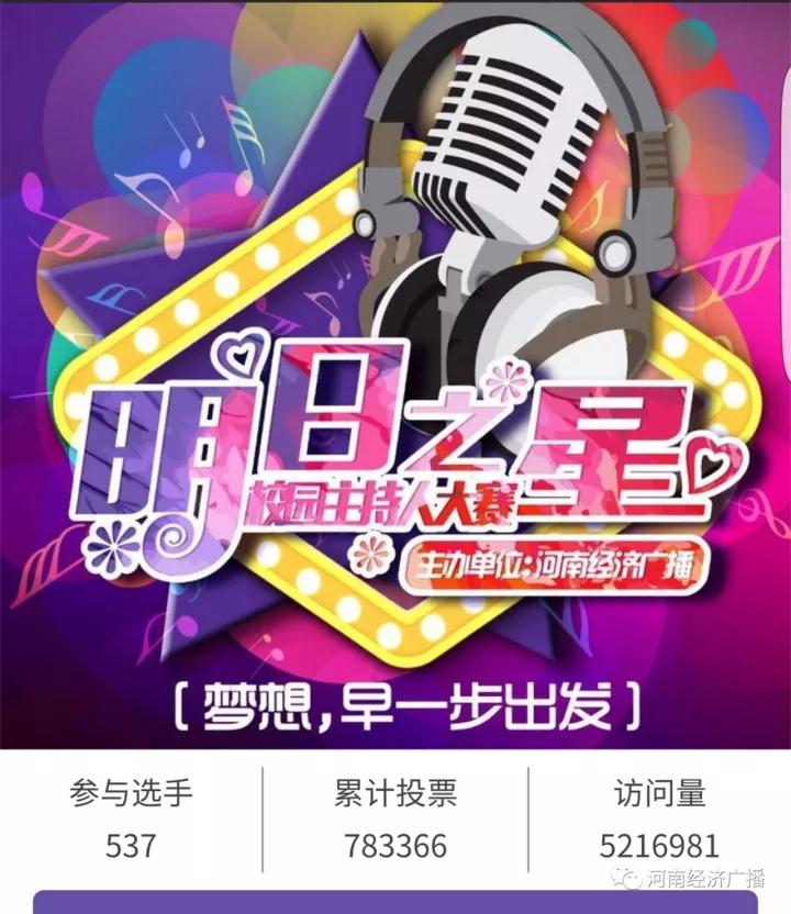 河南經(jīng)濟(jì)廣播·第三屆“明日之星”校園主持人大賽備受矚目,微信投票更是達(dá)到了五百二十一萬的訪問量!經(jīng)過鄭州、安陽、南陽、三門峽、駐馬店、洛陽、開封、新鄉(xiāng)、商丘、林州、漯河、新鄭,十二個賽區(qū)十四個賽點(diǎn),二千六百余人的激烈角逐;再到?jīng)Q賽時選手的精彩表現(xiàn)。一路走來,有驚喜、有歡樂、有學(xué)習(xí)、有思考。