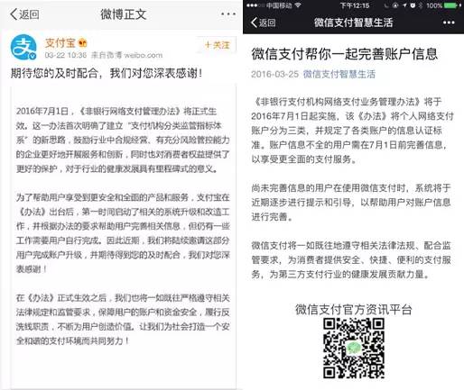 22日,支付寶官方微博發(fā)表聲明稱,“支付寶將在《辦法》出臺(tái)后正式啟動(dòng)相關(guān)系統(tǒng)升級(jí)與改造工作,并且?guī)椭脩暨M(jìn)行相關(guān)操作?!?5日中午,微信支付在其官方賬號(hào)“微信支付智慧生活”發(fā)布了題為《微信支付幫你一起完善賬戶信息》的短文。