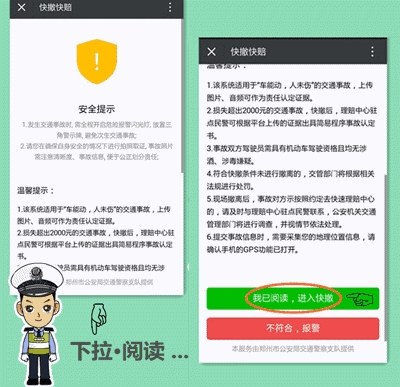 一起簡單的輕微交通事故,如不及時撤離現(xiàn)場,便極易引起交通擁堵。今后,這一現(xiàn)象將在我市得到有效解決,鄭州市交警支隊(duì)科研所和河南省保險(xiǎn)行業(yè)協(xié)會聯(lián)合研發(fā)的交通事故快撤快賠功能在鄭州交巡警二大隊(duì)微信公共平臺上線并試運(yùn)行。