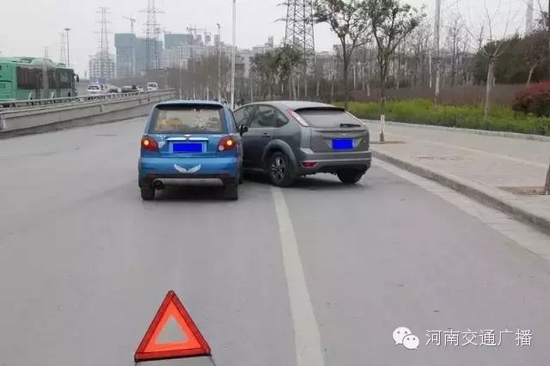 3、為避免發(fā)生次生交通事故,以及在處理事故時被當(dāng)成違法停車誤抓拍,請?jiān)谑鹿侍幚硗戤呏埃涕_啟雙閃燈,放置三角警示牌;
