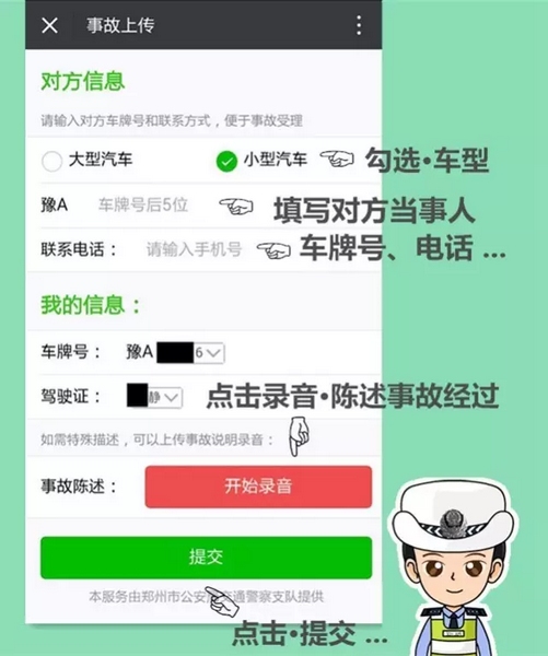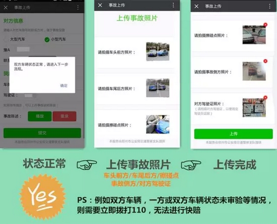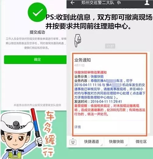 該功能上線后,親們,再也不用站路邊“說個舌尖帶火,嗓子冒煙”了,只需拍幾張現(xiàn)場,照片發(fā)個微信就可以馬上閃人、撤離事故現(xiàn)場!既不造成交通擁堵又安全省力。
