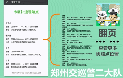4、適用范圍:交警二大隊(duì)轄區(qū)內(nèi)嵩山路(含)嵩山路以西區(qū)域及中原區(qū)、西開發(fā)區(qū)全境,公共道路上發(fā)生的兩車事故,車輛能夠正常駕駛,沒有人員受傷,均適用。