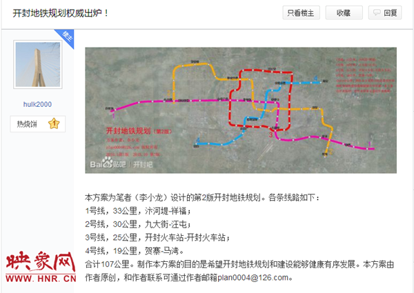 【傳聞】11月初,網(wǎng)絡(luò)上謠傳“開(kāi)封要修建地鐵,市區(qū)內(nèi)規(guī)劃了4條線(xiàn)路”不少開(kāi)封市民在網(wǎng)上看到一則關(guān)于開(kāi)封要修建地鐵的消息,引來(lái)一片熱議,同時(shí)市民在論壇上也有發(fā)帖熱議。