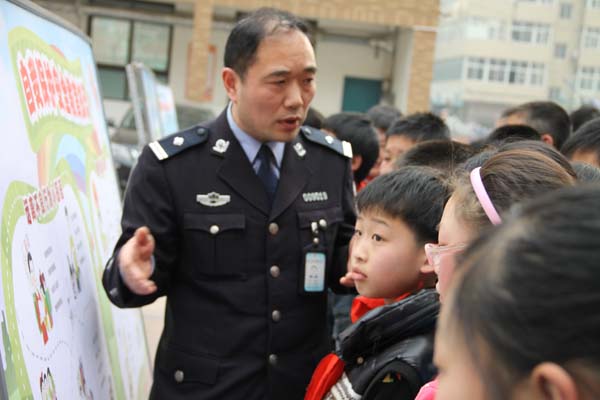 小學(xué)生們認(rèn)真聽(tīng)警察叔叔講解安全知識(shí)