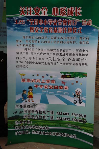 2012年3月26日是第十七個(gè)“全國(guó)中小學(xué)安全教育日”,在教育日當(dāng)天舉行“中小學(xué)安全教育基地”掛牌儀式,河南電臺(tái)信息廣播依托日常欄目《法制新河南》的整合資源,將中小學(xué)安全宣傳教育常態(tài)化。據(jù)河南電臺(tái)信息廣播總監(jiān)李金鋒介紹,“教育基地建立以后,河南電臺(tái)信息廣播將聯(lián)合鄭州市公安局柳林分局,通過(guò)信息廣播AM603、FM105.6廣播頻率,以《法制新河南》欄目為陣地,長(zhǎng)期持久的宣傳中小學(xué)安全教育知識(shí),并為柳林鎮(zhèn)第四小學(xué)的學(xué)生提供書(shū)籍、器械等安全教育的物品,節(jié)目主持人和柳林分局的警官還將不定期的深入校園內(nèi),跟學(xué)生們面對(duì)面的交流、一對(duì)一的輔導(dǎo)?!?/p>