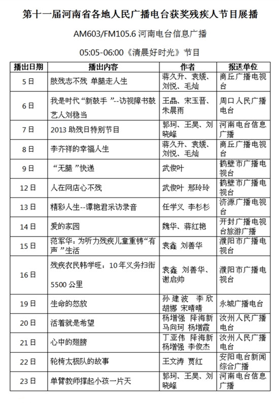 自2014年5月5日起,河南省“第十一屆各地人民廣播電臺殘疾人節(jié)目展播”活動中評選出的優(yōu)秀廣播節(jié)目將在AM603、FM105.6河南人民廣播電臺信息廣播《清晨好時光》節(jié)目中陸續(xù)播出。