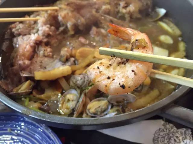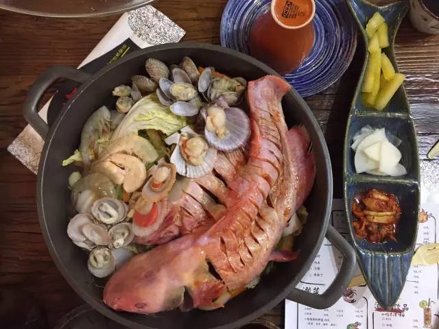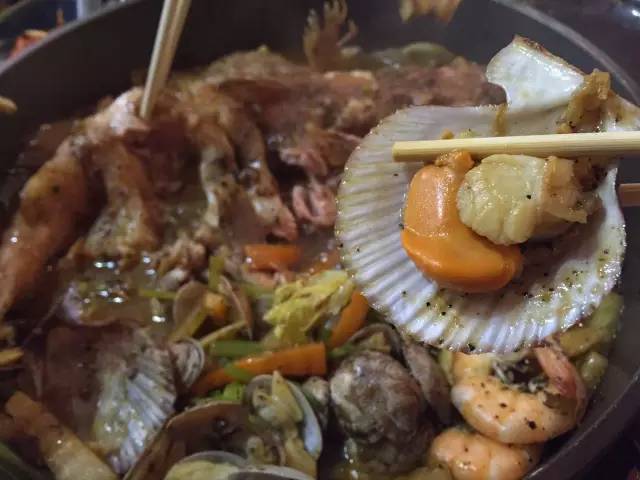 以魚、扇貝、大蝦和時蔬為鍋底,先燜制,后以米酒澆鍋,點火后,能看到火焰在食材上跳躍,聞到淡淡的酒香,最后的醬料可以拌意面吃,有黑椒、麻辣和酸菜三種口味。
