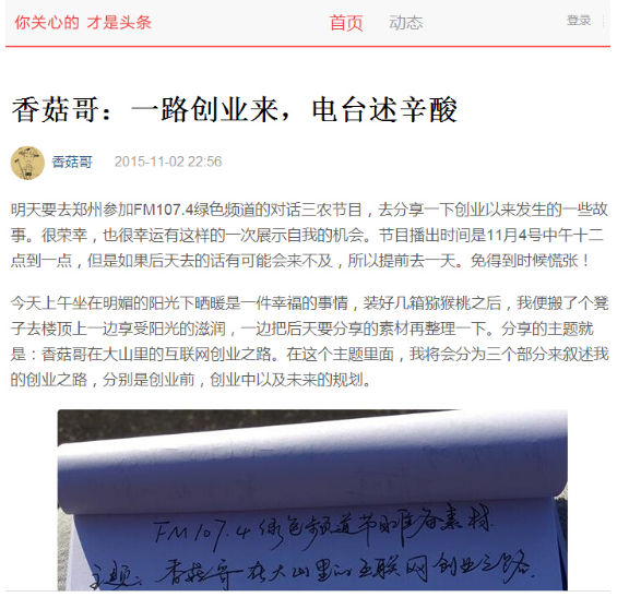 自媒體,以“香菇哥”的名義在各個自媒體平臺申請入駐,最先申請的是搜狐媒體平臺,運作的這幾個月,搜狐上的累計閱讀量目前已達到16萬。后來又申請了今日頭條,一點咨詢,鳳凰新聞媒體平臺等渠道。也建立了自己的微信公眾號。目前所有的宣傳渠道的累計閱讀量已經(jīng)突破了七十萬。就是在這些渠道上宣傳自己的創(chuàng)業(yè)故事以及大山里面的人文風情來傳播。