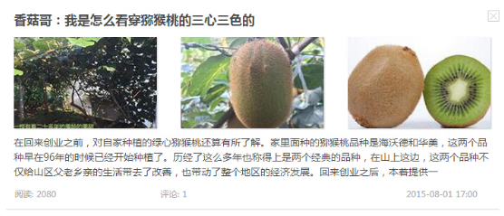 通過這些文章的傳播,我認識到了很多的朋友,這些朋友也給我提供了很多的幫助,通過他們我開拓了視野,對獼猴桃有了更加深刻的了解。這些幫助都來自于這些文章的宣傳。雖然有時候晚上熬夜到凌晨的兩三點,但是我覺得正是這份辛苦,讓我更加體會到創(chuàng)業(yè)帶來的精神上的收獲。