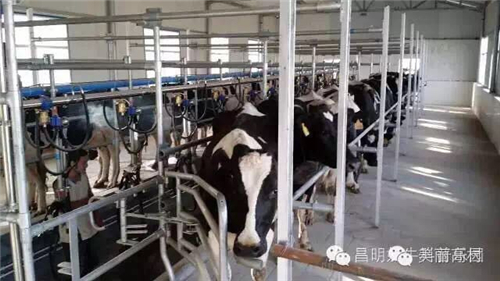 產(chǎn)奶期的奶牛從自己的牛舍成群結隊的有序步入擠奶廳,進入擠奶廳后,每只奶牛都要先洗澡,然后人工擠掉前三把牛奶,裝好擠奶器,牛奶就從奶牛的體內(nèi)經(jīng)管道直接進入冷藏罐了。我們可以站在觀景平臺上,透過高清玻璃,可以清楚的看到擠奶廳內(nèi)奶牛排隊擠奶的壯觀場景。