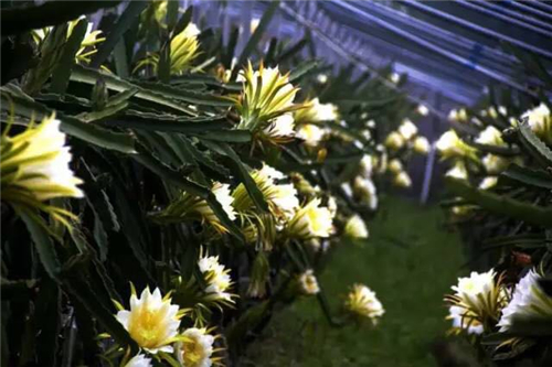 金田地大棚火龍果晚上八九點(diǎn)開始開花,持續(xù)到第二天早上九十點(diǎn)鐘閉合。