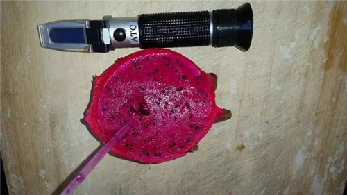 ▼魯山金田地火龍果園區(qū)現(xiàn)場(chǎng)采摘甜度測(cè)試