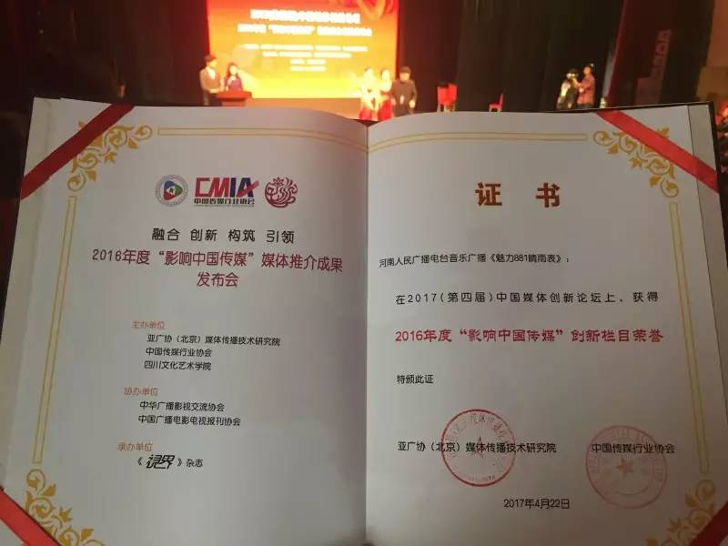 我們魅力881河南音樂廣播獲得2016年度”影響中國(guó)傳媒“最具創(chuàng)新力媒體獎(jiǎng),《魅力881晴雨表》獲得2016年度“影響中國(guó)傳媒”創(chuàng)新欄目獎(jiǎng),DJ 陽陽出席論壇及典禮,與來自全國(guó)的媒體同仁進(jìn)行交流,分享廣播影視產(chǎn)業(yè)的寶貴經(jīng)驗(yàn)。