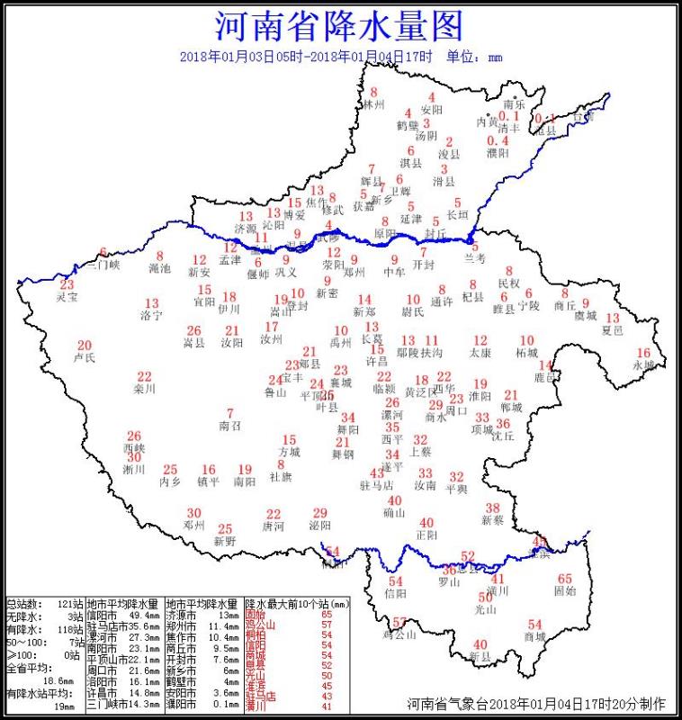 3-4日,河南自西向東出現(xiàn)明顯降雪過(guò)程,除豫東北部分縣市外,全省其它地市均出現(xiàn)大到暴雪,中南部大部分地區(qū)出現(xiàn)20毫米以上大暴雪,其中信陽(yáng)、駐馬店和南陽(yáng)部分縣市出現(xiàn)30毫米以上特大暴雪。全省平均降雪量18毫米,本次降雪具有降雪量大、積雪深厚、多站日降雪量突破1月歷史極值的特點(diǎn)。