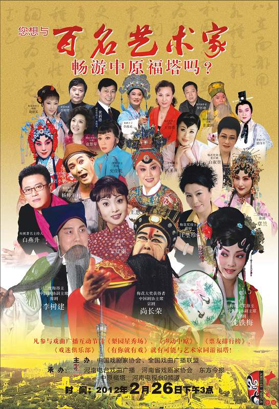 河南電臺戲曲廣播、河南省戲劇家協(xié)會發(fā)起并聯(lián)合中國戲劇家協(xié)會、全國戲曲廣播聯(lián)盟共同推出的“全國百名藝術(shù)家暢游中原福塔”觀光活動將于2012年2月26日下午3點舉行。
