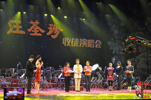 本次成為汪荃珍徒弟的分別是許昌市豫劇團(tuán)的何艷芳和三團(tuán)的韓亞冰,在拜師儀式上,著名戲劇評論家荊樺用“常大師的好學(xué)生、舞臺上的好演員、劇團(tuán)里的好團(tuán)長、朋友們的好朋友”來形容汪荃珍,汪荃珍自己也說,要銘記常香玉大師的教誨——“先做人,后演戲,戲比天大”,為戲曲事業(yè)培養(yǎng)更多優(yōu)秀人才。讓人印象深刻的是,汪荃珍沒有按照傳統(tǒng)的形式接受弟子的行禮,而是與弟子攜手共同向全場觀眾三鞠躬致意,贏得了觀眾們熱烈的掌聲,之后,汪荃珍與兩位弟子一起表演了《香魂女》當(dāng)中的經(jīng)典選段,將整場演出的氣氛推向了高潮。
