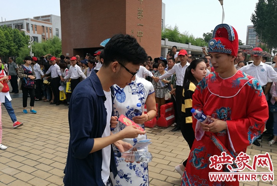 除了特殊的公交助考服務(wù)車,公交一公司1路車長(zhǎng)郭磊穿著狀元服為參加高考的考生送去“紅包”,讓不少考生頗感意外。而且引來了不少家長(zhǎng)和考生的競(jìng)相合影。