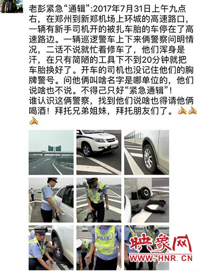 據(jù)介紹,7月31日9時許,河南省公安廳高速交警總隊一支隊執(zhí)勤民警徐玉成、余曉偉巡邏到機場高速與鄭州西南繞城高速互通處附近時,看到北向南方向一輛白色轎車停在高速路邊,上前一看車輛前輪輪胎爆胎了,司機急著去開會卻不會修車,急得滿頭大汗卻無從下手,民警了解情況后,二話沒說在酷暑高溫天氣迅速幫司機把車胎換好,司機連聲表示感謝,由于當時急著去開會,沒有來得及問出民警姓名,于是就出現(xiàn)了開頭“緊急通緝”的一幕,公司領導和員工也紛紛轉發(fā)正能量,“通緝”找人。伸手幫一把,傳遞正能量一大片。