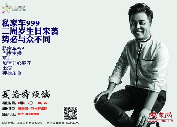 活動(dòng)內(nèi)容:正值私家車(chē)999兩歲生日來(lái)臨之際,私家車(chē)999特邀開(kāi)心麻花全國(guó)票房口碑雙料冠軍《夏洛特?zé)馈吩卩嵵菹髣?chǎng)開(kāi)演,私家車(chē)999主持人將擔(dān)綱劇中角色,9月6日、9月7日象劇場(chǎng)鄭州藝術(shù)宮,一起來(lái)過(guò)生日吧!